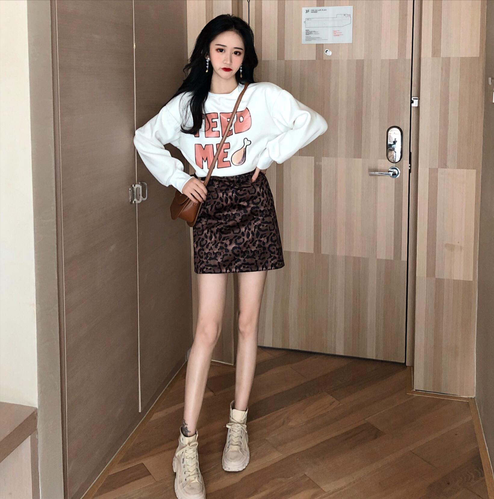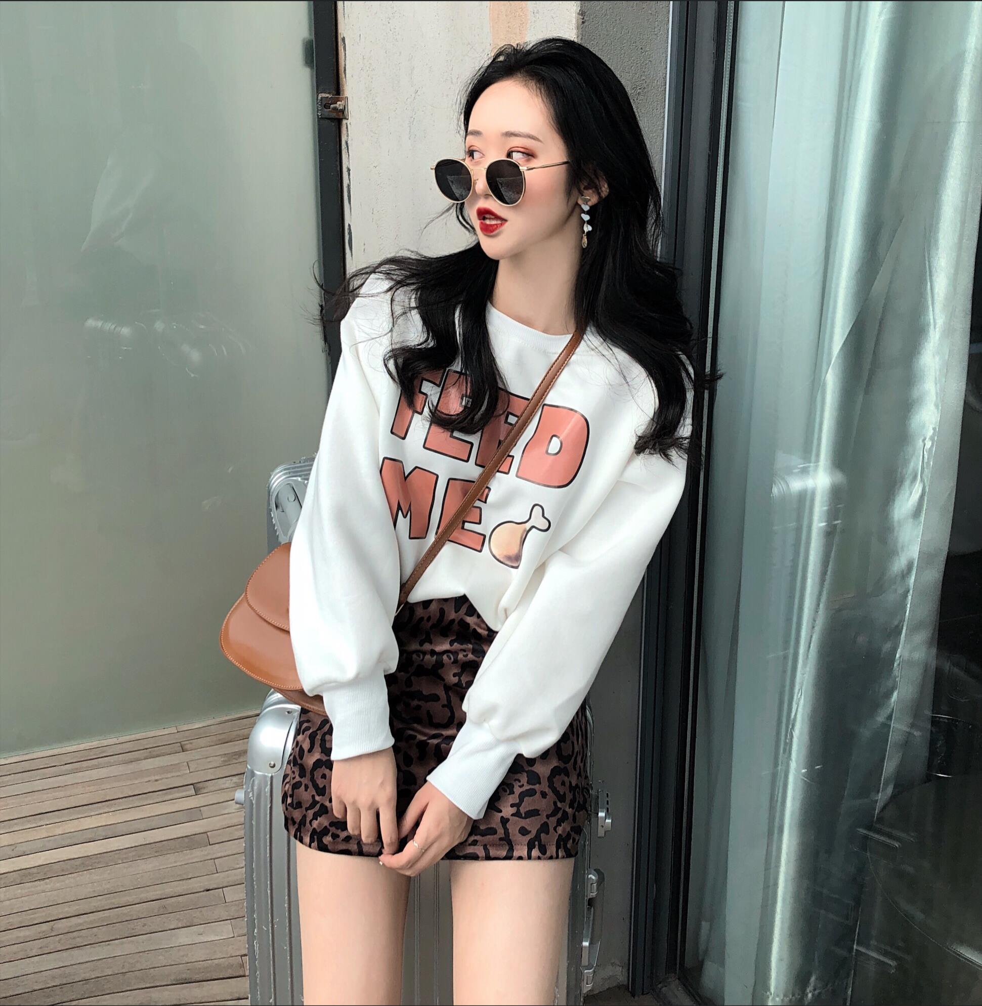 復古秋裝女2018新款套裝百搭字母印花衛衣女+百搭豹紋短裙兩件套