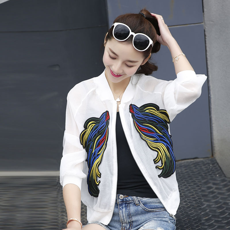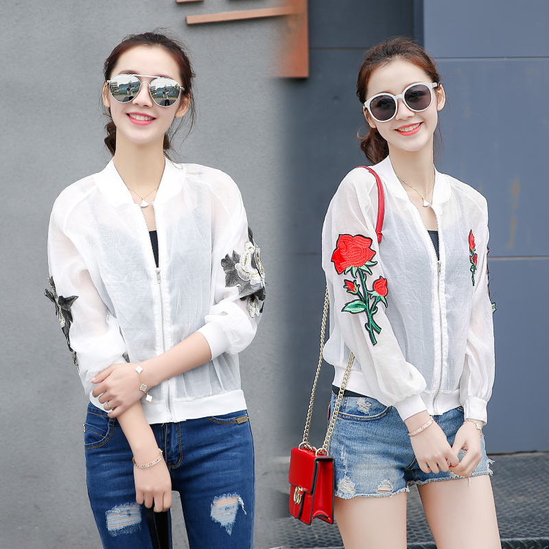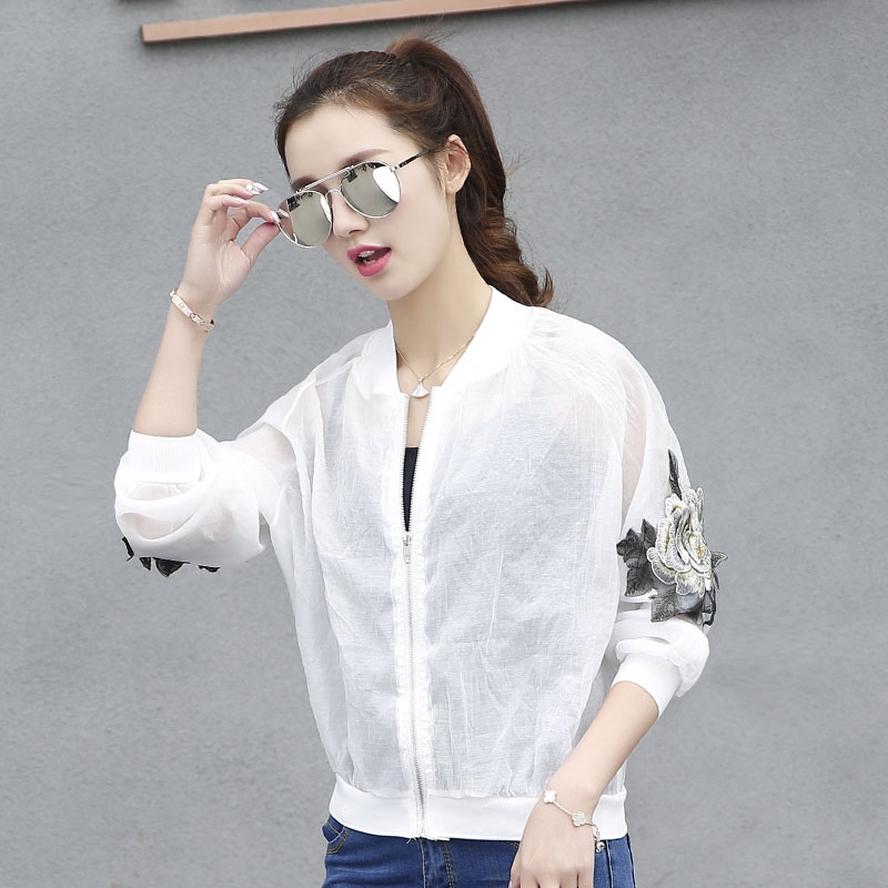/ 春秋夏季新款刺繡棒球服白色薄外套女防曬衣韓版寬松短夾克衫