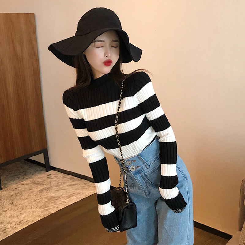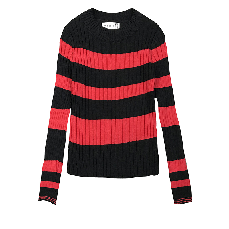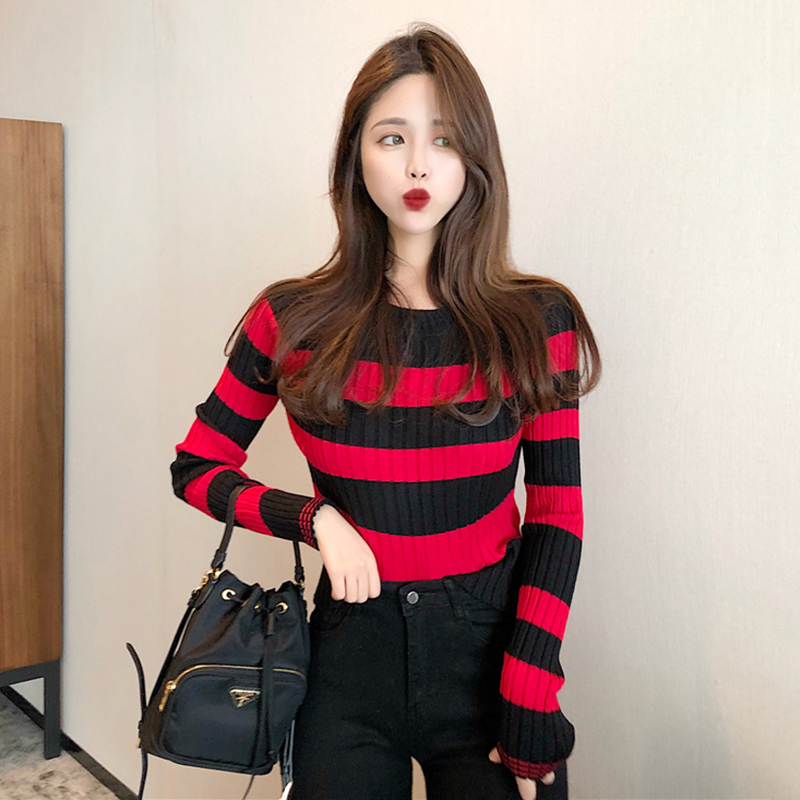 / 條紋針織衫女2018新款復古港風修身長袖打底衫洋氣圓領短上衣秋裝