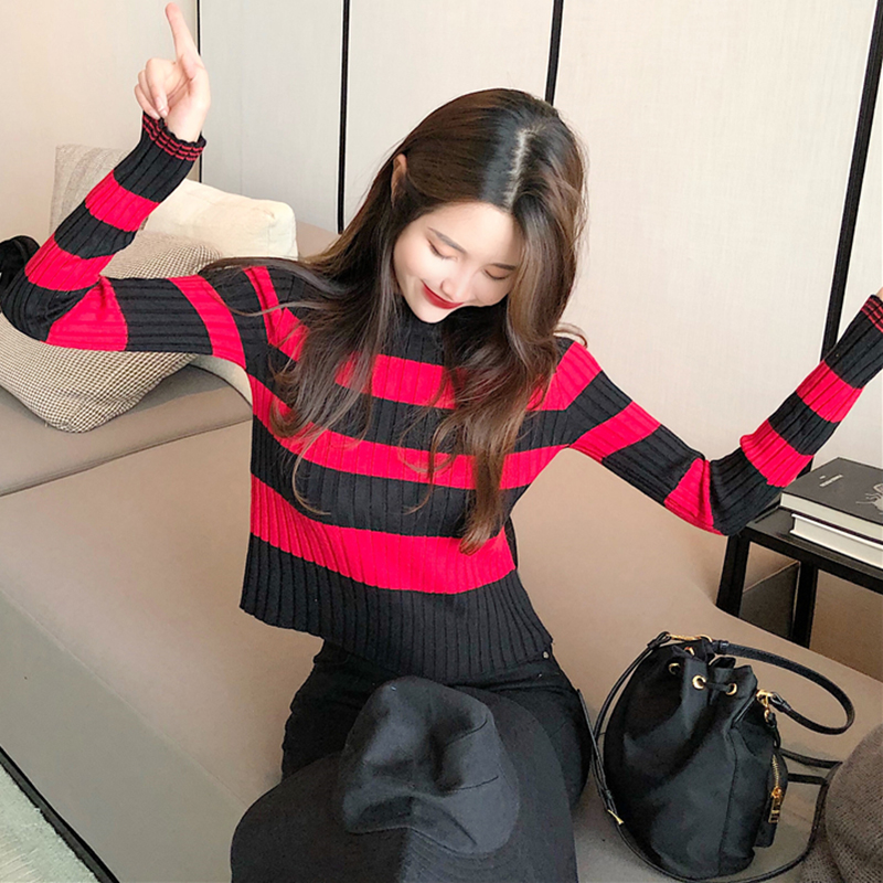 條紋針織衫女2018新款復古港風修身長袖打底衫洋氣圓領短上衣秋裝