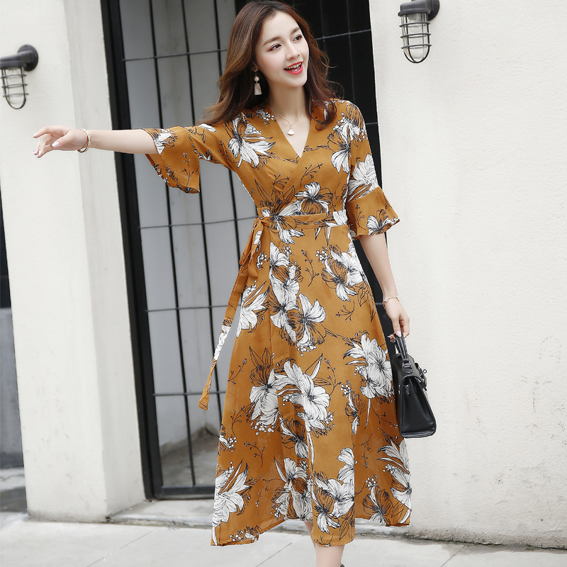/ 夏季波西米亞印花V領沙灘收腰雪紡連衣裙露肩過膝大擺長裙女