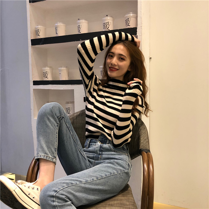 / 慵懶風套頭毛衣女2018新款秋冬修身顯瘦高領條紋加厚打底針織衫女
