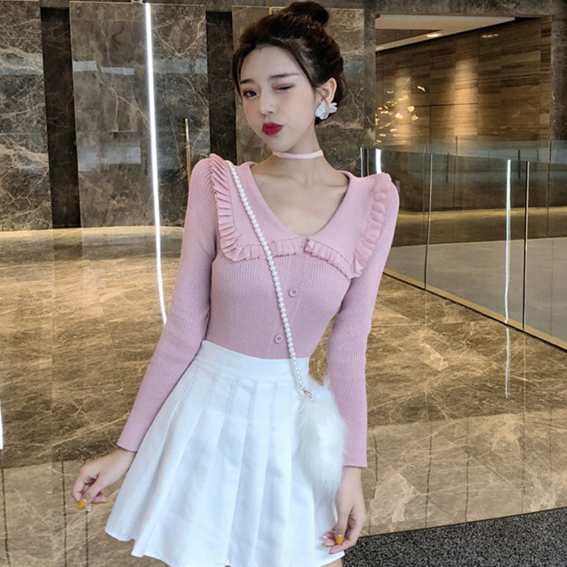 / 甜美木耳邊拼接娃娃領打底針織衫女秋裝新款氣質修身黑色長袖上衣