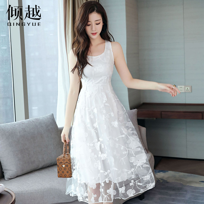 傾越2017新款夏裝甜美小清新蕾絲無袖連衣裙雪紡公主沙灘背心裙潮