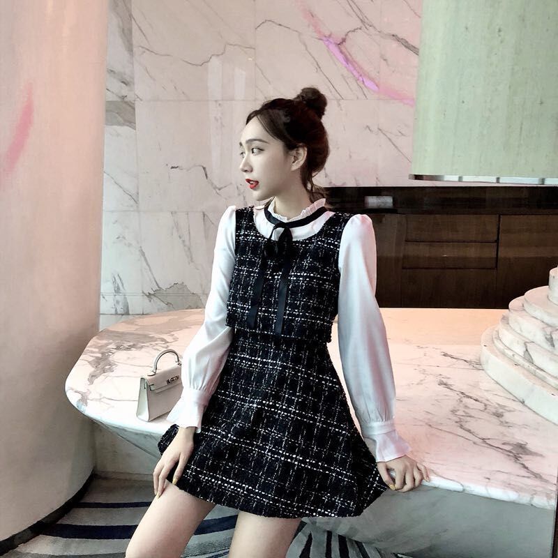 / 2018秋裝chic新款顯瘦氣質小香風長袖假兩件裙子呢子套裝連衣裙女