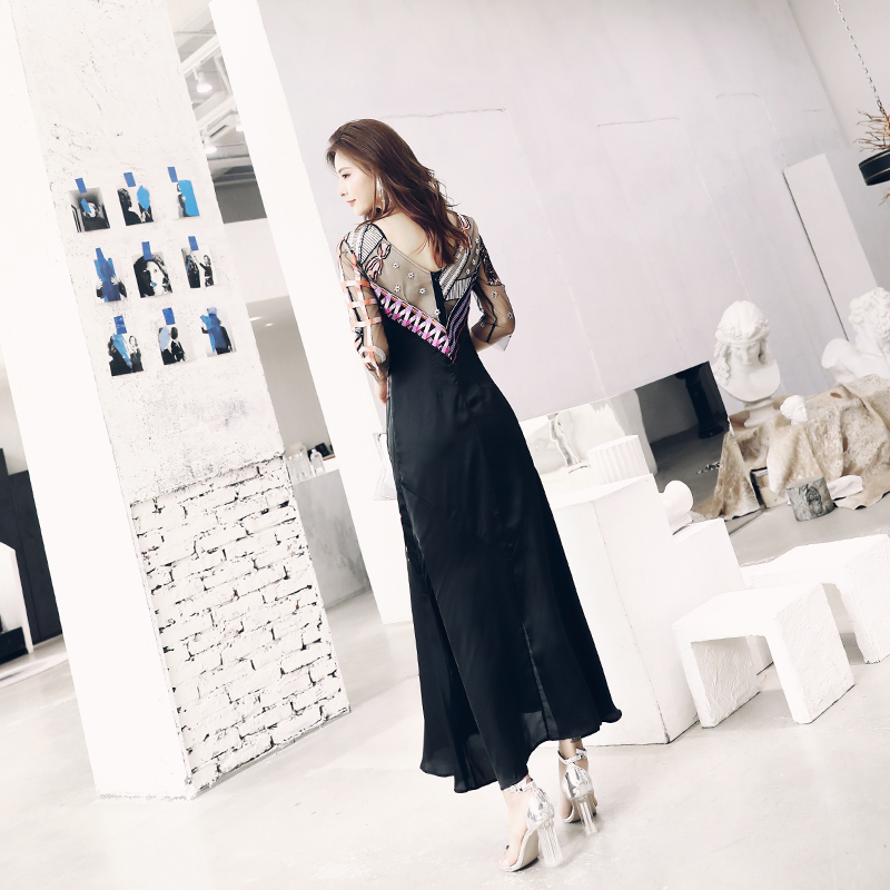 / S秀2018新款英倫風百搭繡花印花慵懶風顯瘦圓領五分袖連衣裙