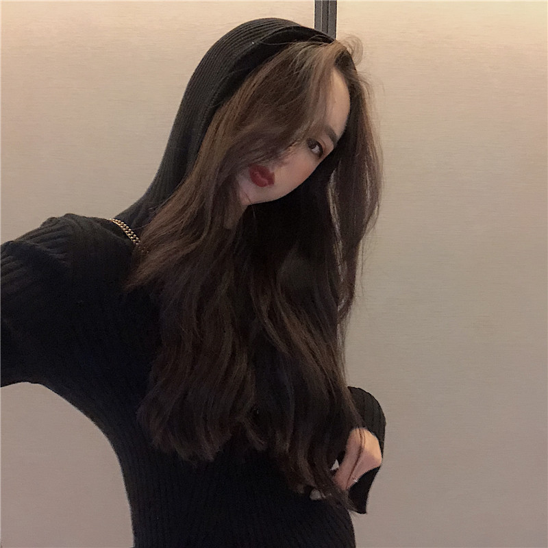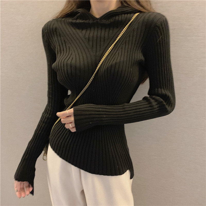 套頭毛衣女秋冬2018新款氣質修身不規則顯瘦連帽針織打底純色上衣
