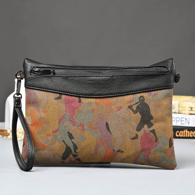 日系新款男士手拿包復古迷彩人帆布配皮手包韓版男包單肩斜跨包