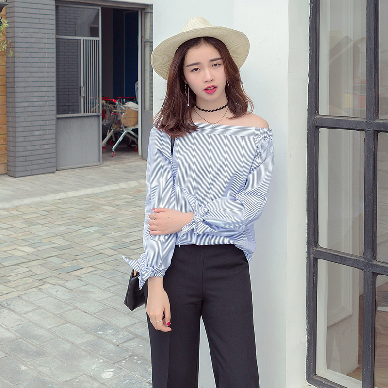 春裝新款時尚條紋襯衫女一字領露肩喇叭長袖韓范百搭襯衣上衣