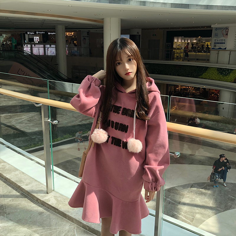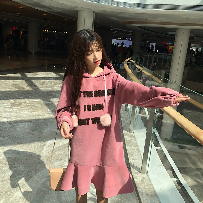/ 秋冬女裝韓版寬松字母刺繡抽繩毛球中長款加絨加厚長袖衛衣連衣裙