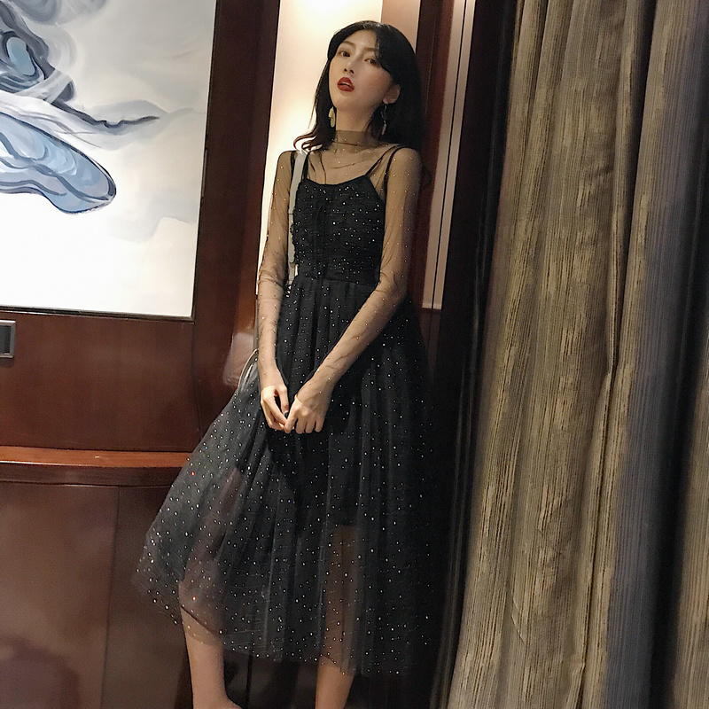 早秋兩件套裙女氣質網紗上衣亮片網紗裙韓版時尚套裝2018新款女裝