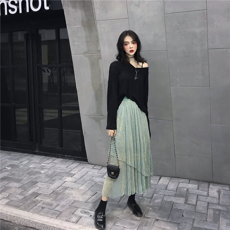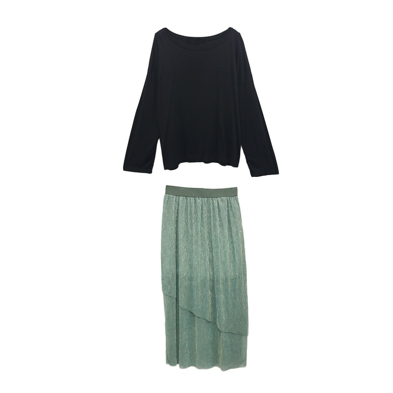 秋裝女2018新款套裝時尚兩件套溫柔舒適蛋糕半身裙+大圓領兩穿Tee