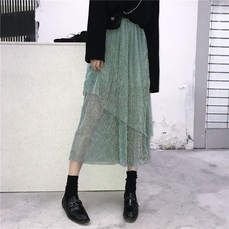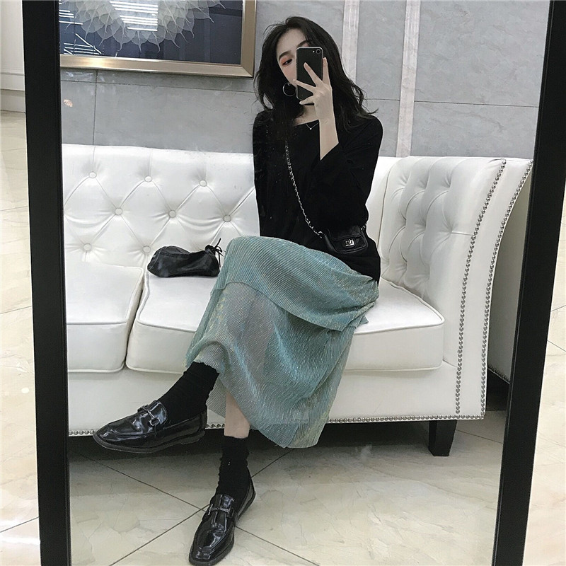 秋裝女2018新款套裝港味亮絲上衣+高腰閃閃亮絲半身裙時尚兩件套