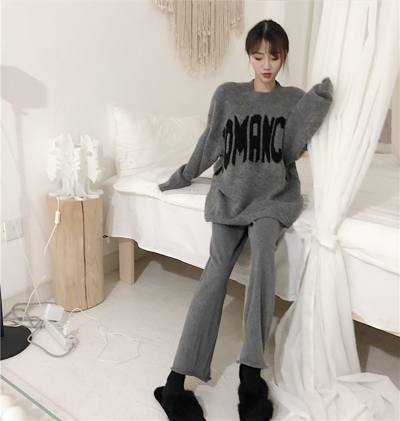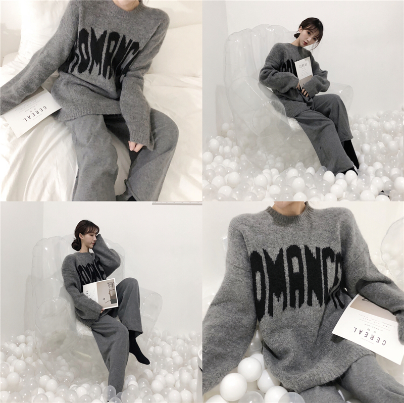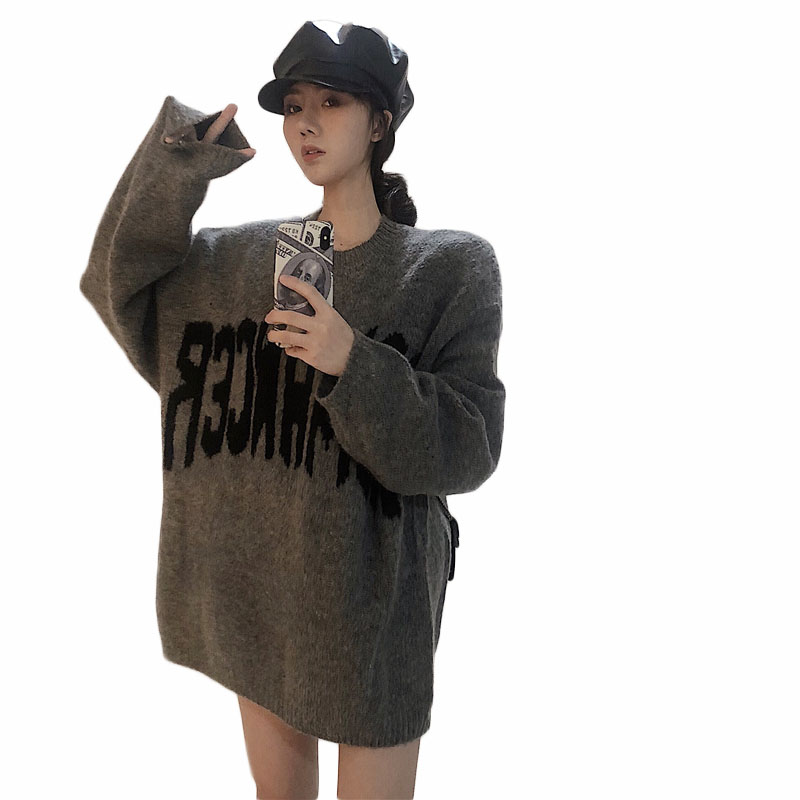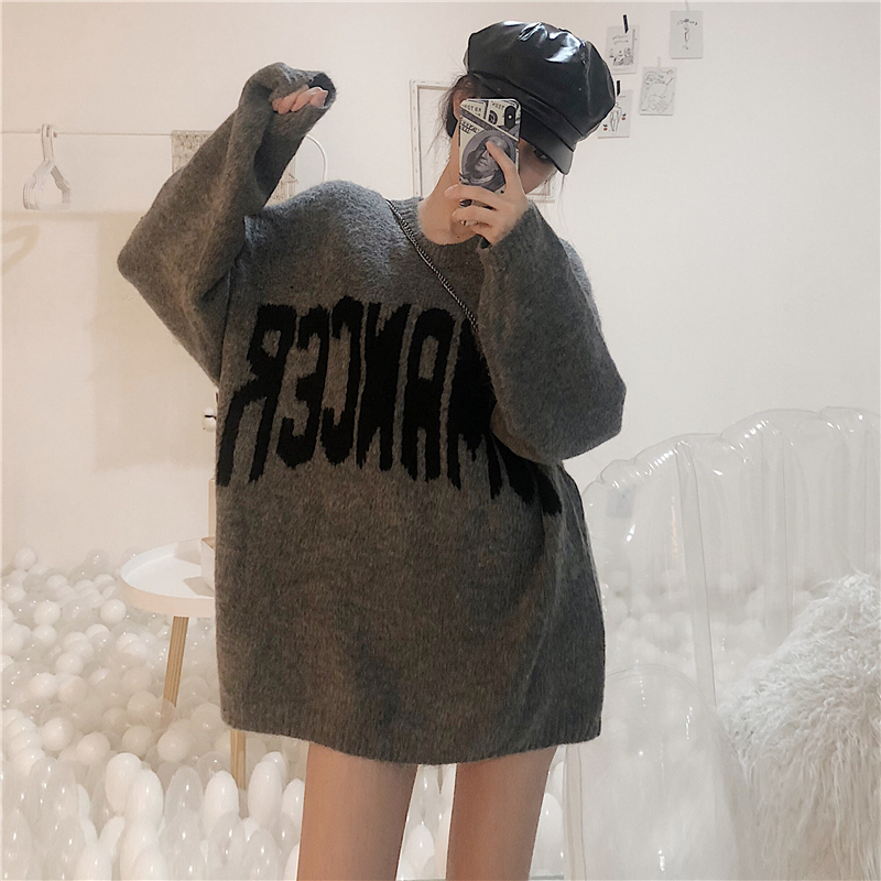 韓版網紅同款2018新款秋冬寬松慵懶風套頭毛衣女中長款字母針織衫