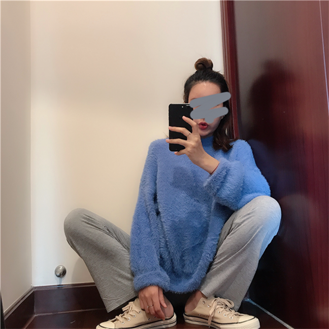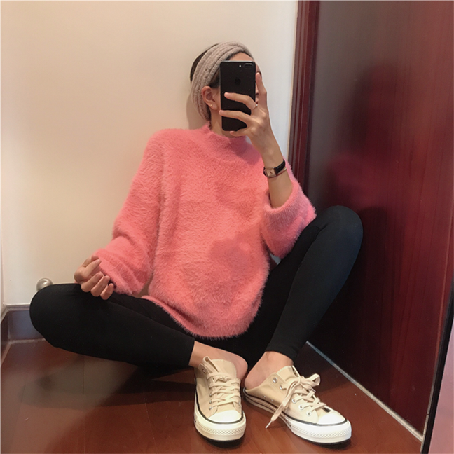 復古港味慵懶風毛衣女套頭開叉貂絨百搭半高領中長款寬松針織衫潮
