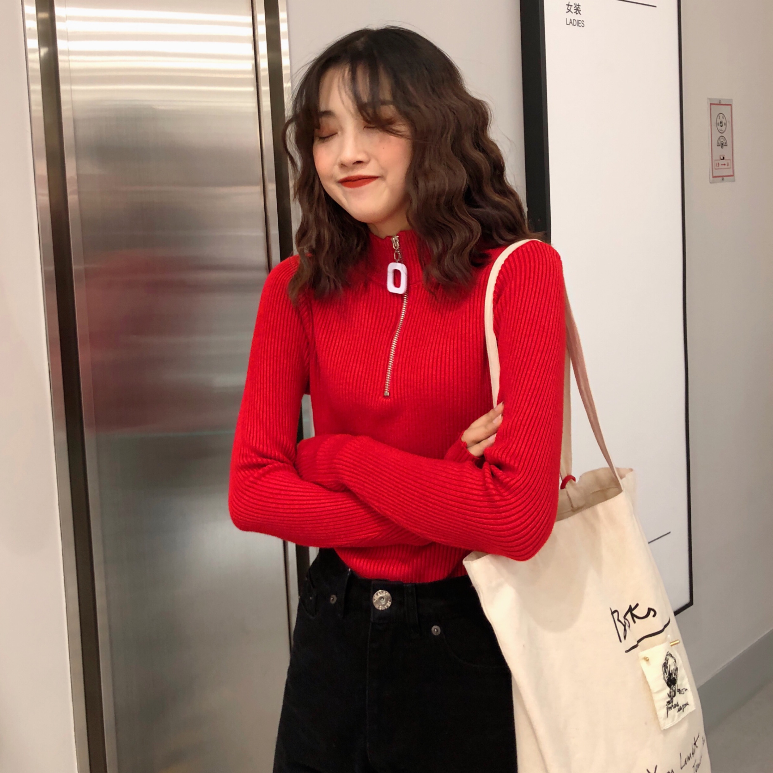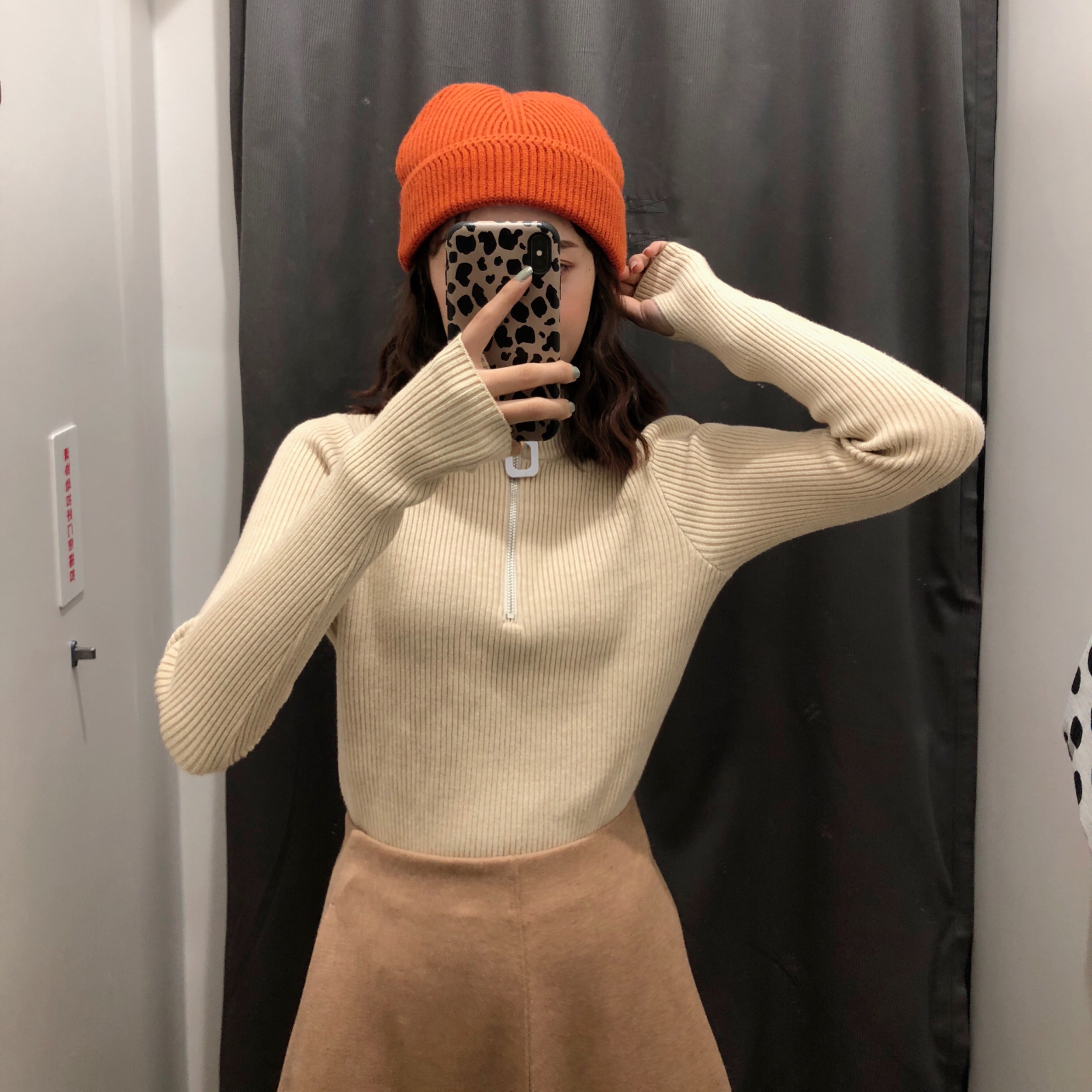 秋冬韓版純色修身顯瘦拉鏈半高領長袖打底衫套頭針織衫毛衣上衣女