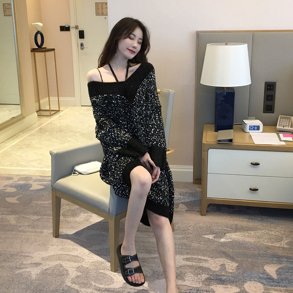 港味復古慵懶風套頭毛衣女2018新款秋加厚長款針織毛衣裙連衣裙女