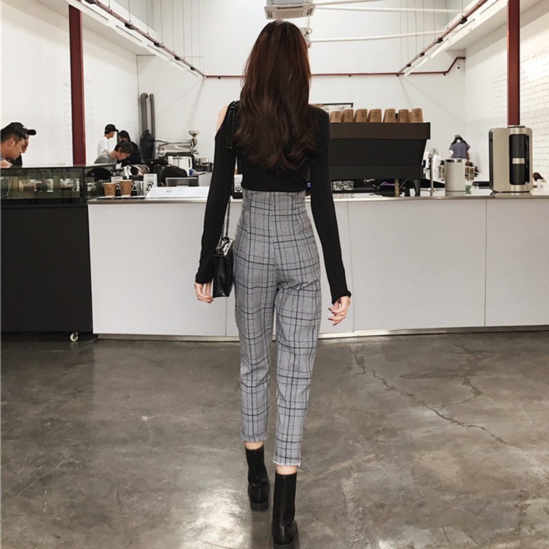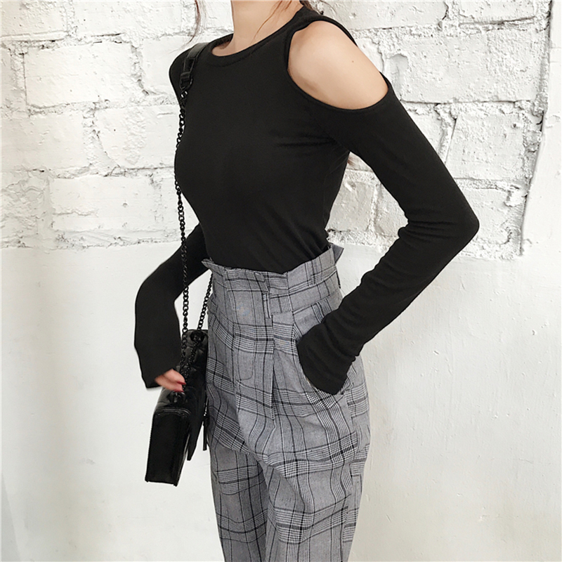 港味套裝女秋2018新款修身長袖打底T恤露肩上衣高腰格子休閑褲子