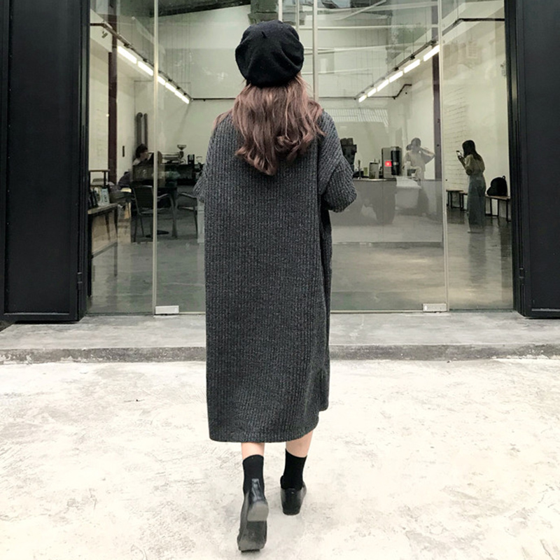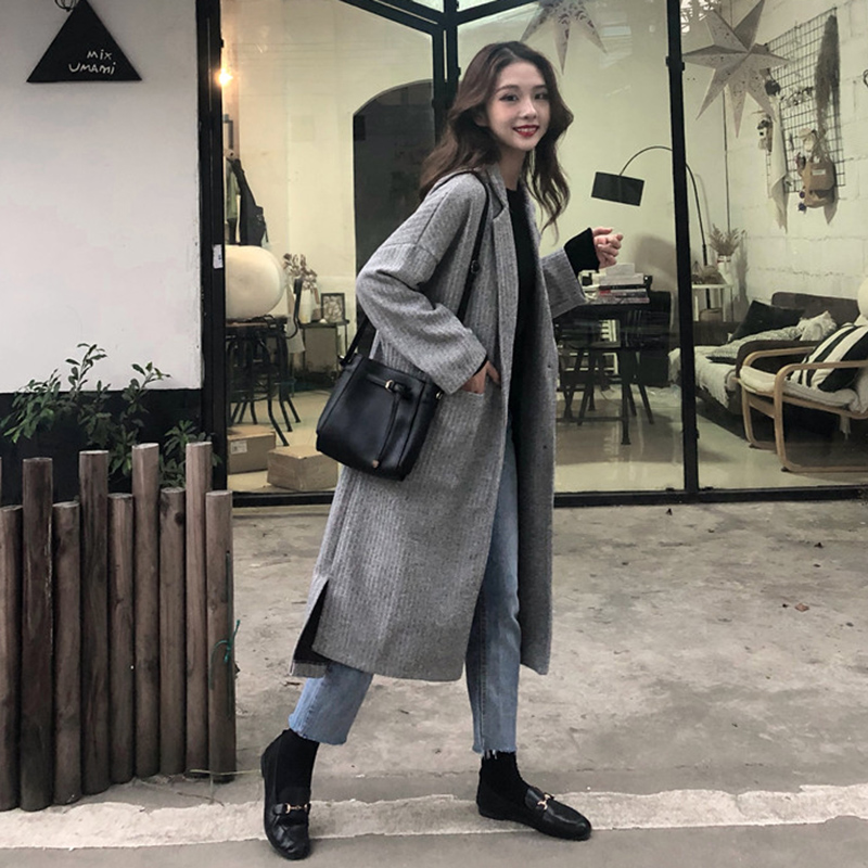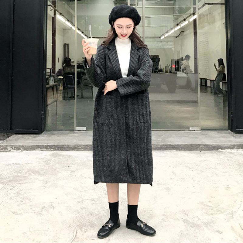 港味復古毛呢外套女2018新款學生寬松中長款過膝開叉休閑長袖大衣