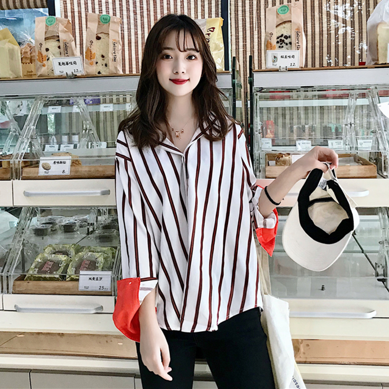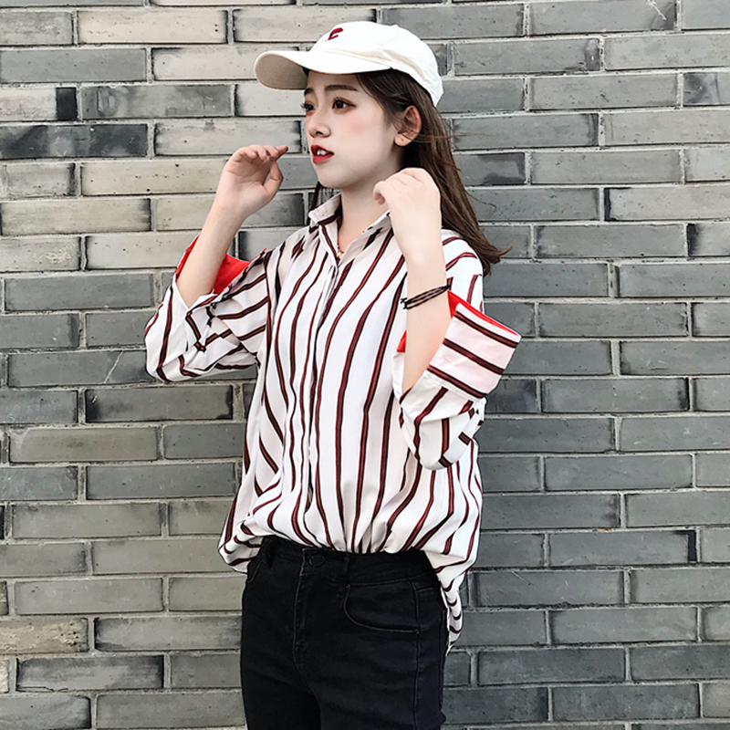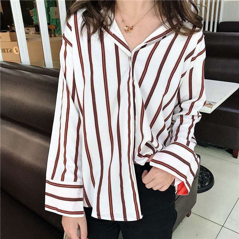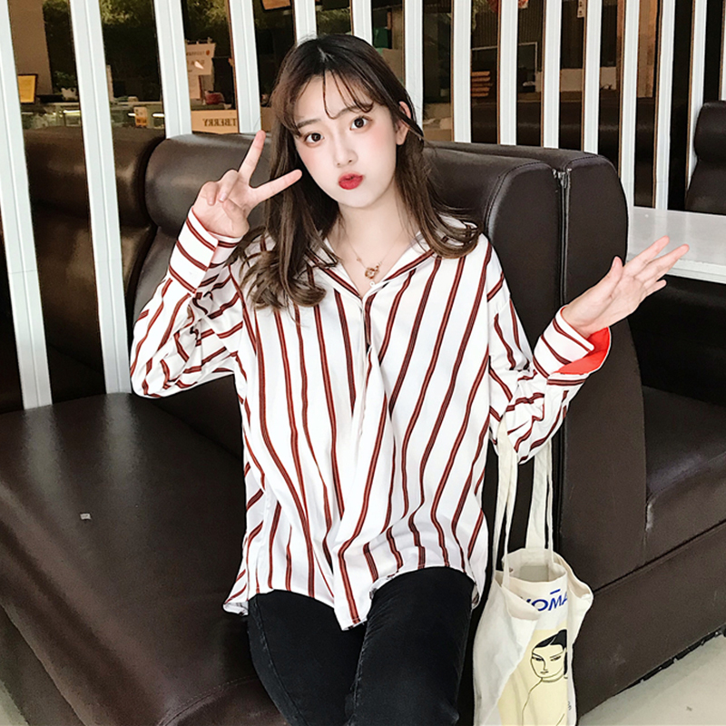 / 港味復古豎條紋襯衫女學生休閑寬松長袖上衣秋裝新款時尚翻領襯衣