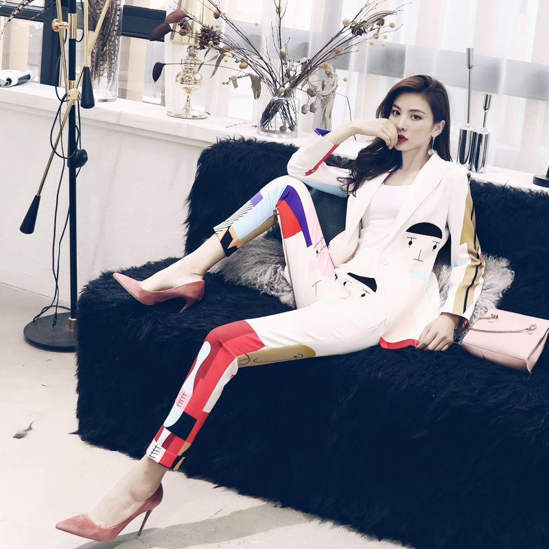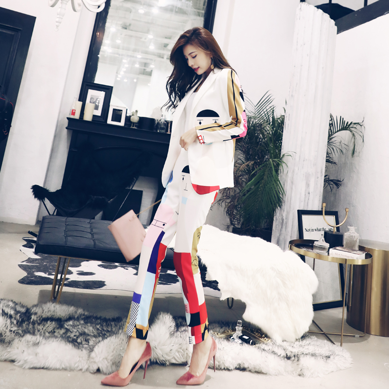 / 印花西裝套裝女初秋裝2018新款時尚氣質顯瘦小腳褲復古港味兩件套