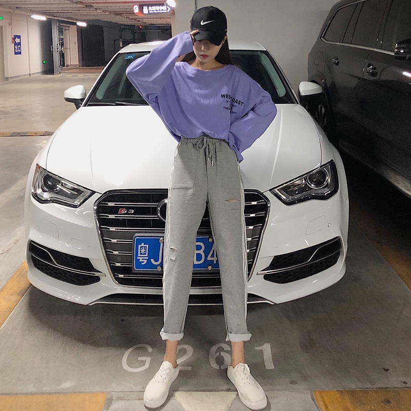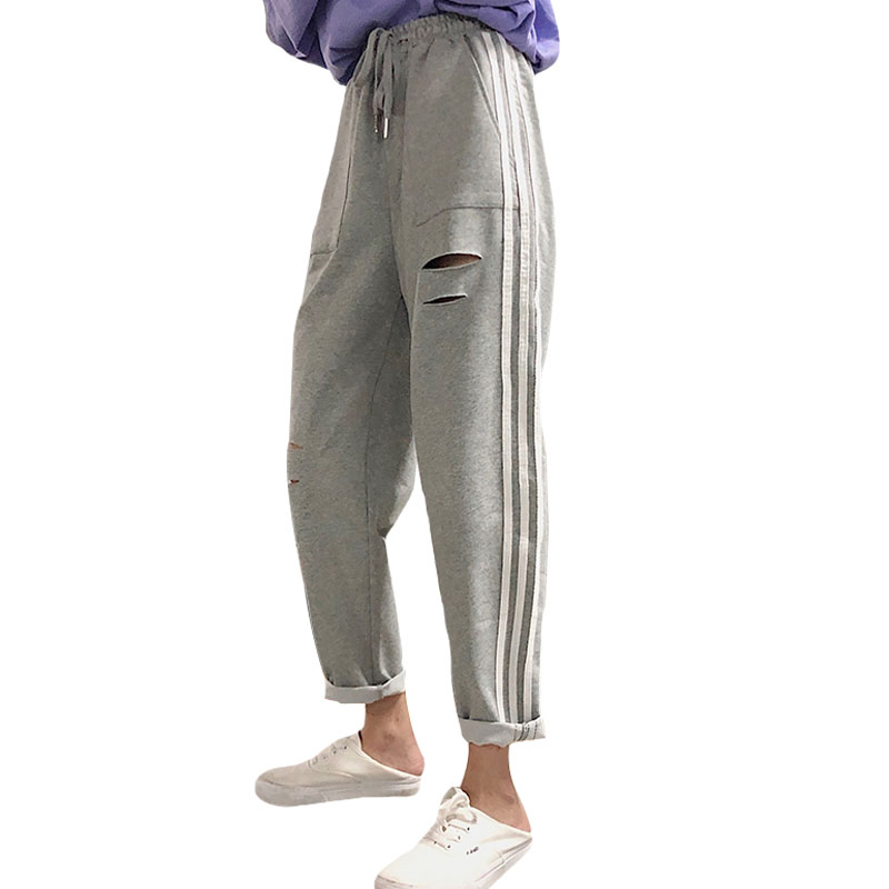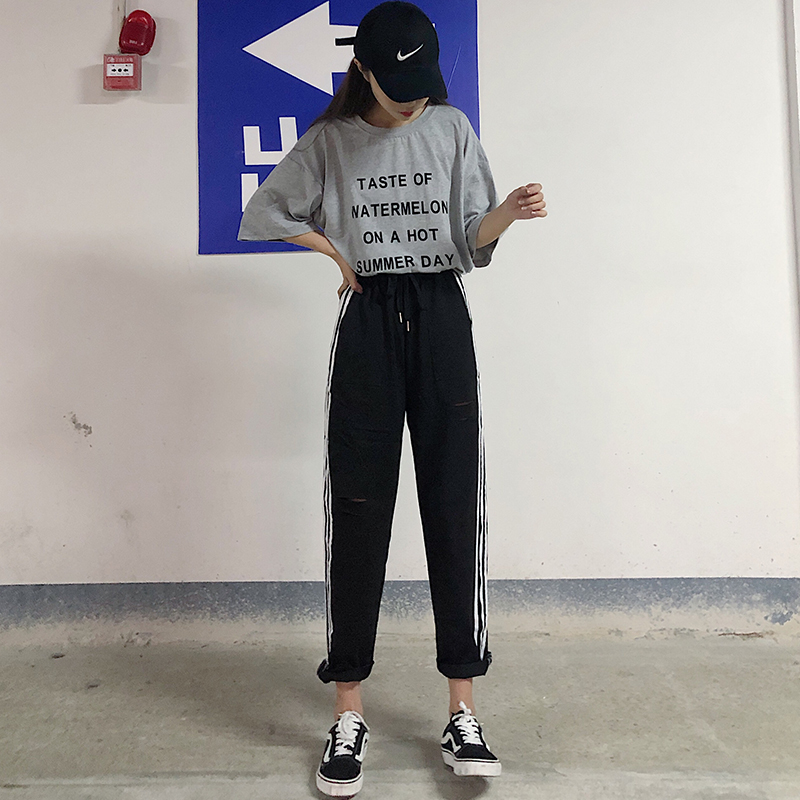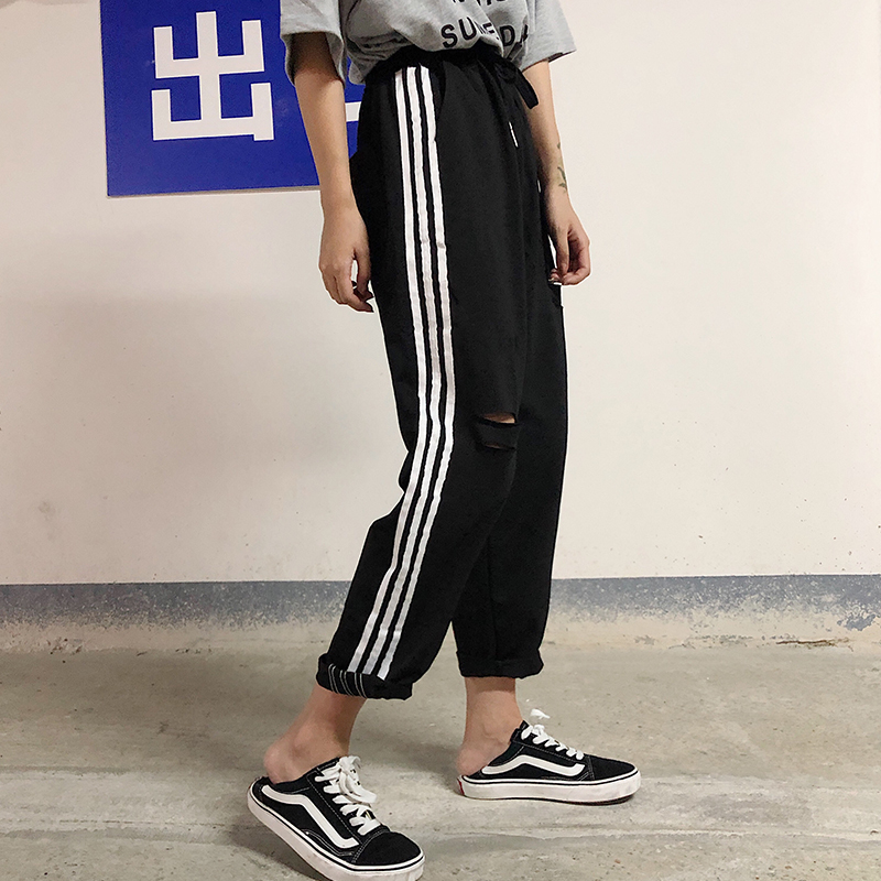 / 秋裝女裝韓版寬松百搭破洞條紋休閑褲學生高腰運動褲哈倫褲九分褲
