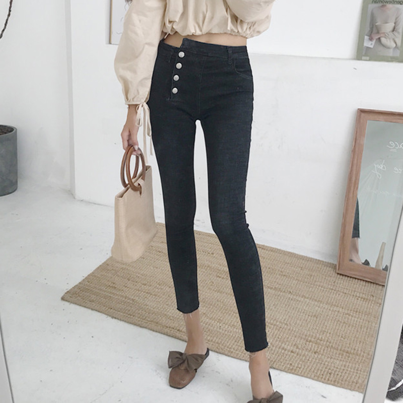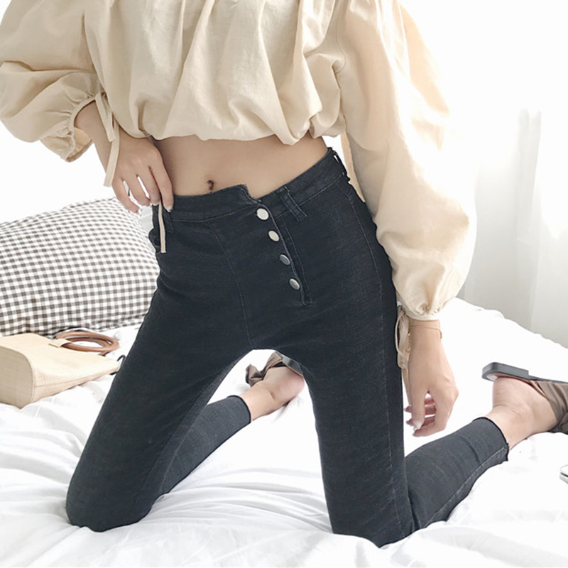 復古牛仔褲早秋新款女裝高腰黑色多扣九分小腳褲修身彈力鉛筆褲子