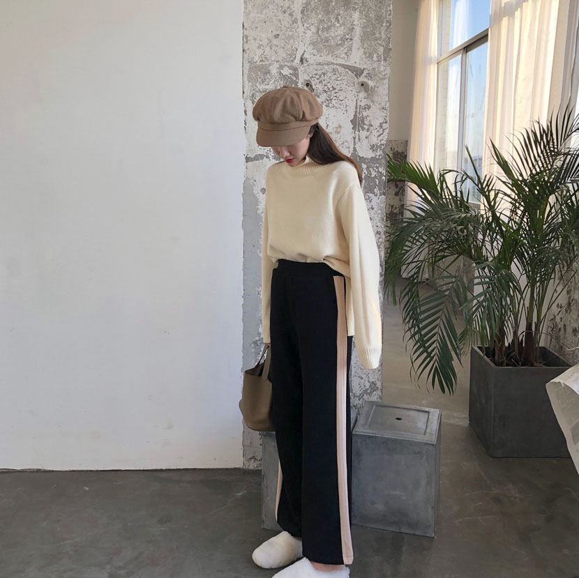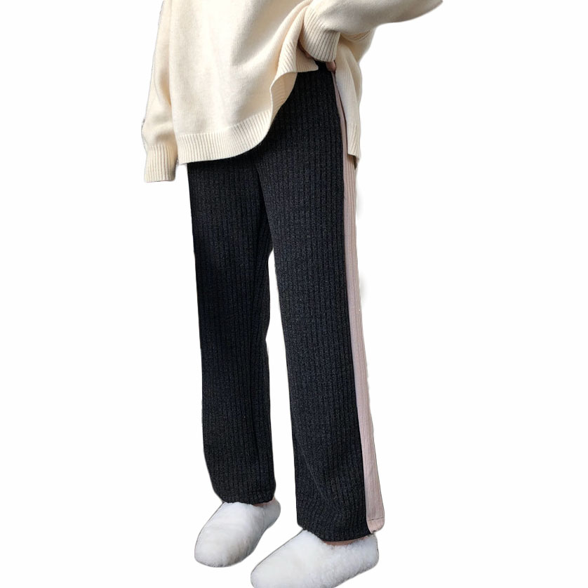 / 秋冬2018新款復古韓國針織墜感撞色闊腿褲女高腰直筒針織褲休閑褲