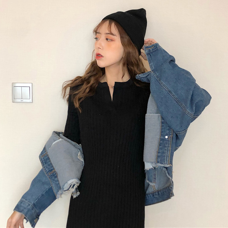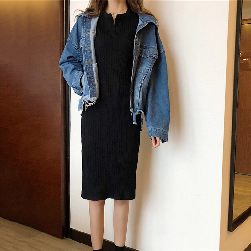 / 法式開叉針織連衣裙子女秋冬裝新款修身顯瘦中長款黑色包臀桔梗裙