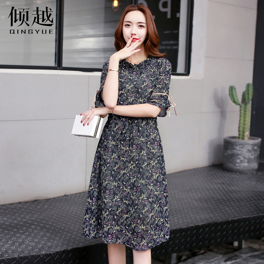 / 傾越2017新款春夏韓版小碎花雪紡連衣裙中長款顯瘦長袖圓領百褶裙
