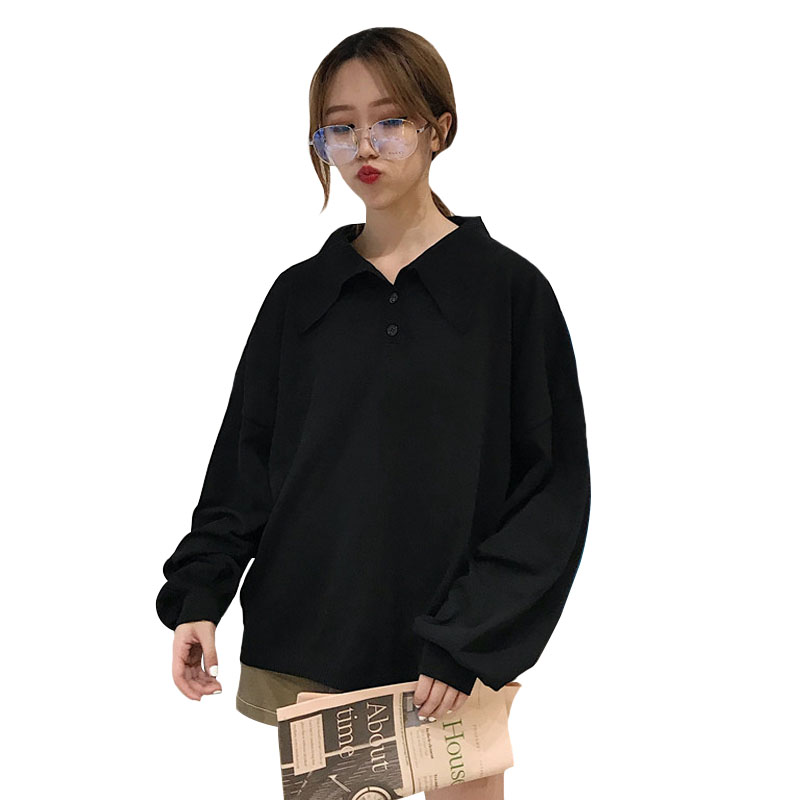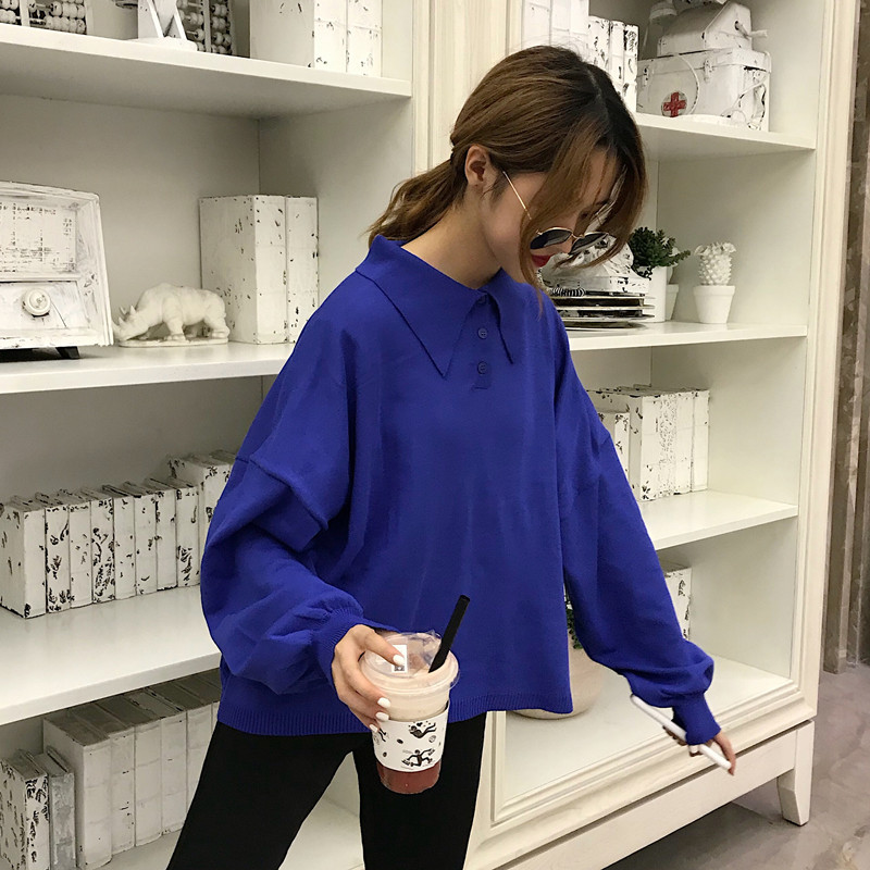 / 秋季女裝韓版chic寬松慵懶風純色polo領套頭燈籠袖毛衣針織衫上衣