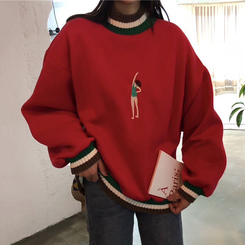 / 秋冬女裝2018新款韓版寬松小高領套頭衛衣學生刺繡小人加絨衫外套