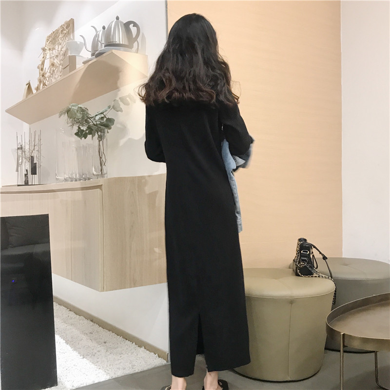 韓版女裝秋冬2018新款女裙子過膝顯瘦后開叉高領打底長裙連衣裙女