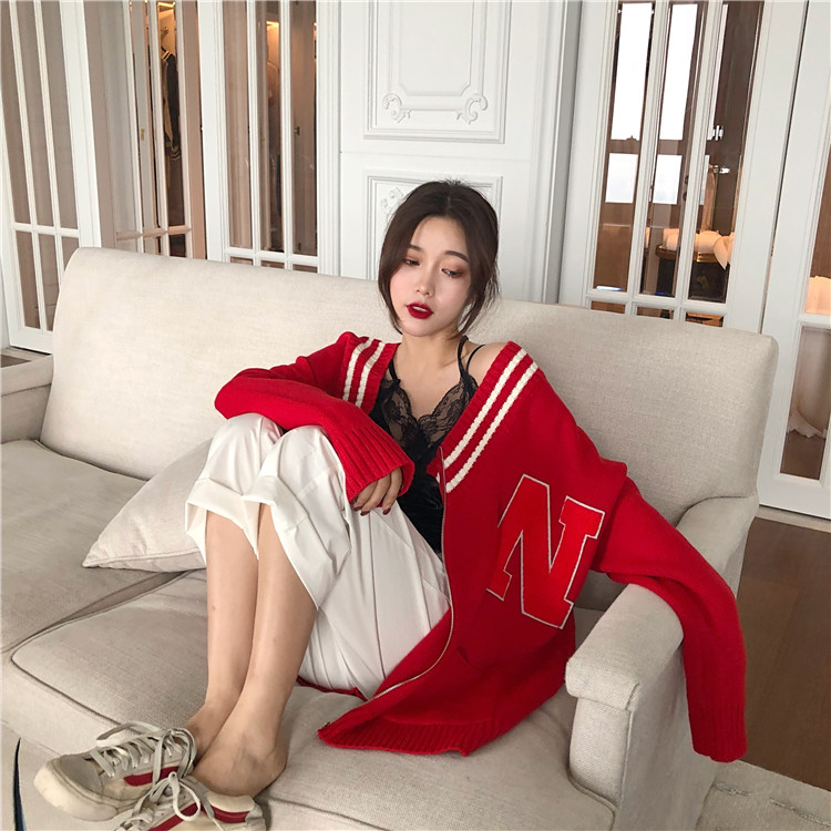 / 復古韓國chic風寬松V領棒球針織毛衣女2018新款N字母拉鏈開衫外套