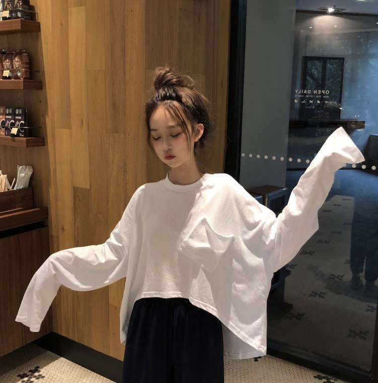 / 秋裝女裝韓版前短后長寬松百搭純色t恤長袖休閑顯瘦打底體恤上衣