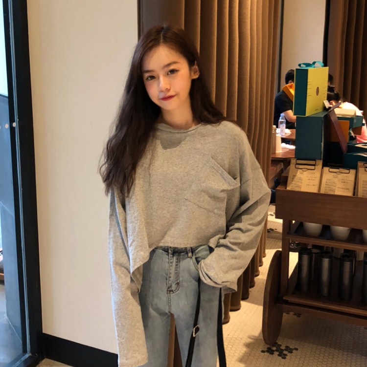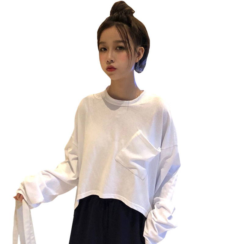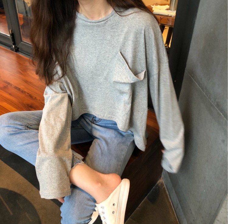 秋裝女裝韓版前短后長寬松百搭純色t恤長袖休閑顯瘦打底體恤上衣