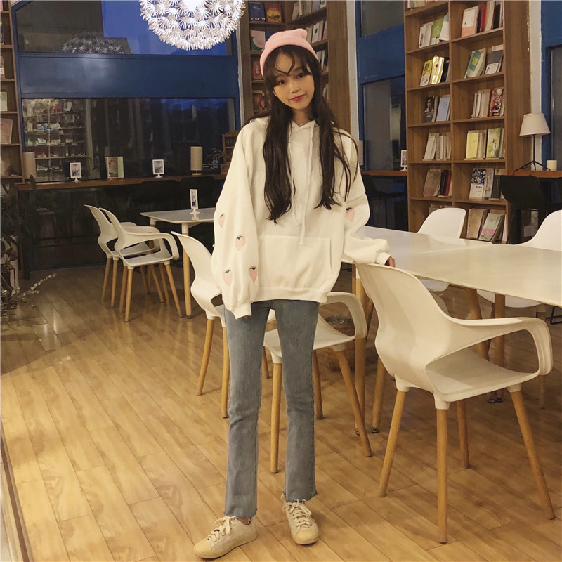 / 秋冬女裝韓版BF風寬松刺繡草莓連帽加絨加厚套頭超火衛衣上衣外套