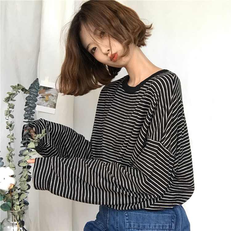 秋裝女裝韓版復古寬松長袖針織衫百搭圓領顯瘦條紋T恤打底衫上衣