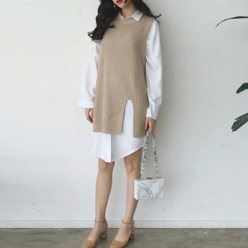 / 秋裝新款韓版寬松中長款針織衫開叉套頭無袖背心毛衣馬甲女裝