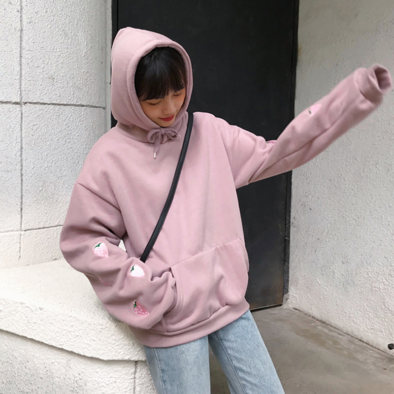 2018新款女裝慵懶寬松長袖草莓印花衛衣學生秋冬加絨連帽上衣外套