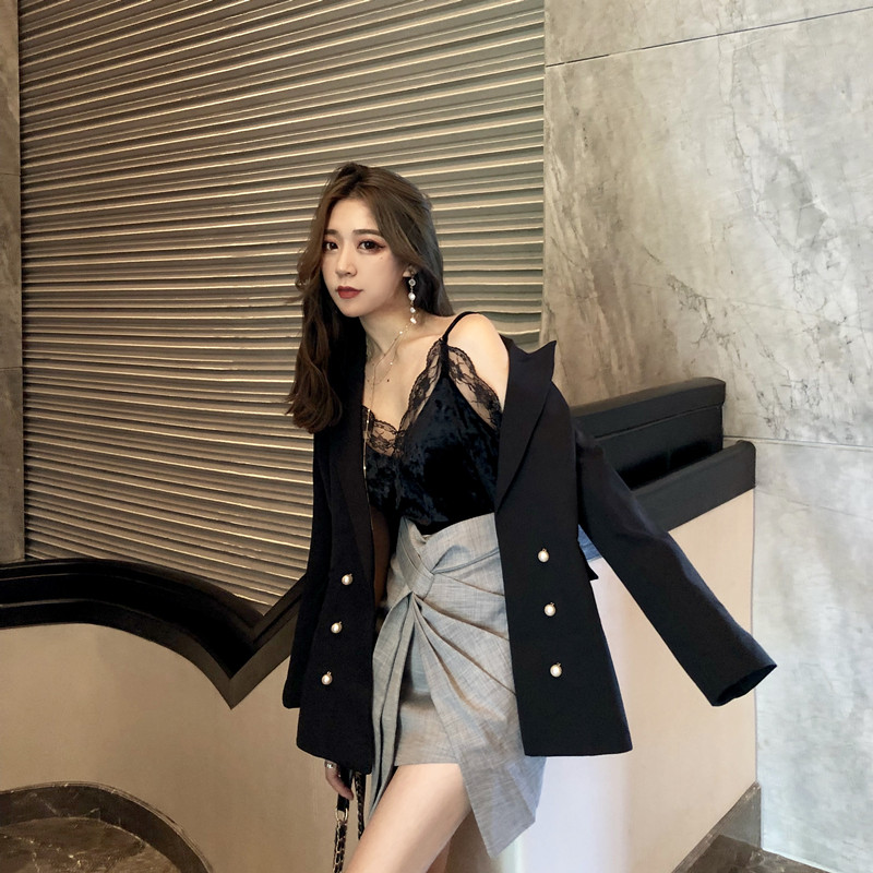 秋裝女2018新款套裝小心機吊帶背心V領性感露肩蕾絲上衣+西裝外套