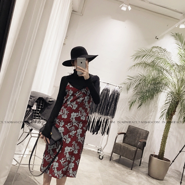 自制 韓國吊帶V領印花下擺荷葉波浪兩側開叉連衣裙女