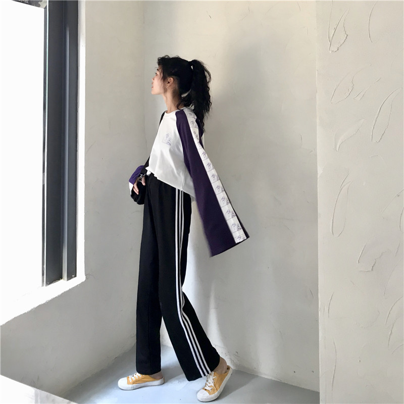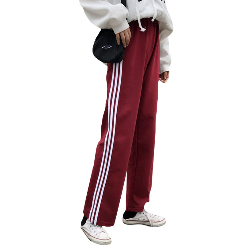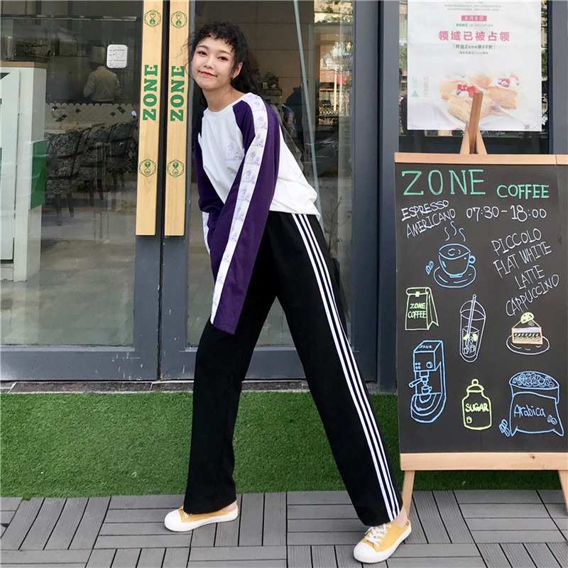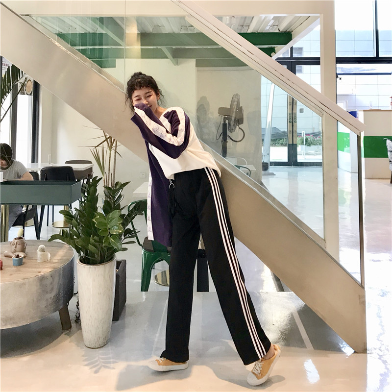秋季韓版網紅同款三條杠運動褲直筒褲長褲學生高腰闊腿褲休閑褲女