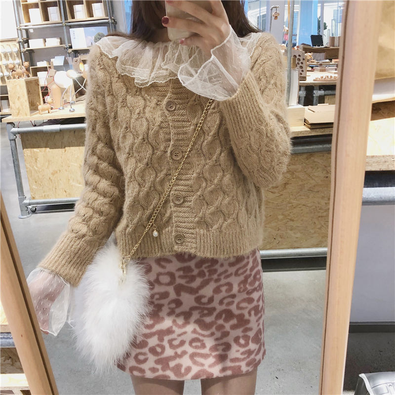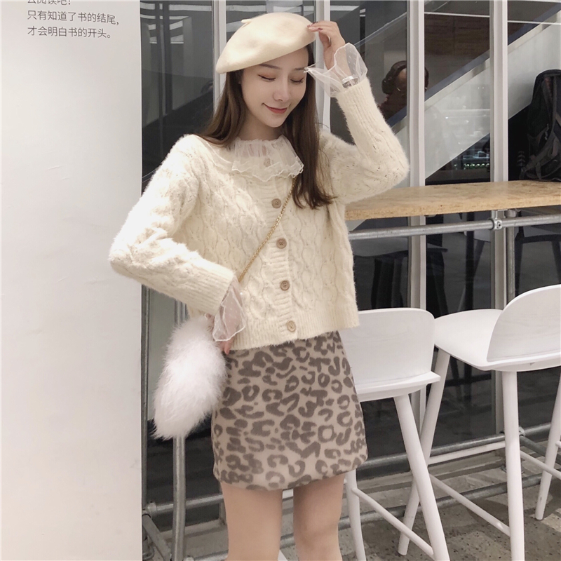 / 韓版仙女荷葉邊翻領打底衫+豹紋包臀裙+單排扣圓領毛衣女2018新款