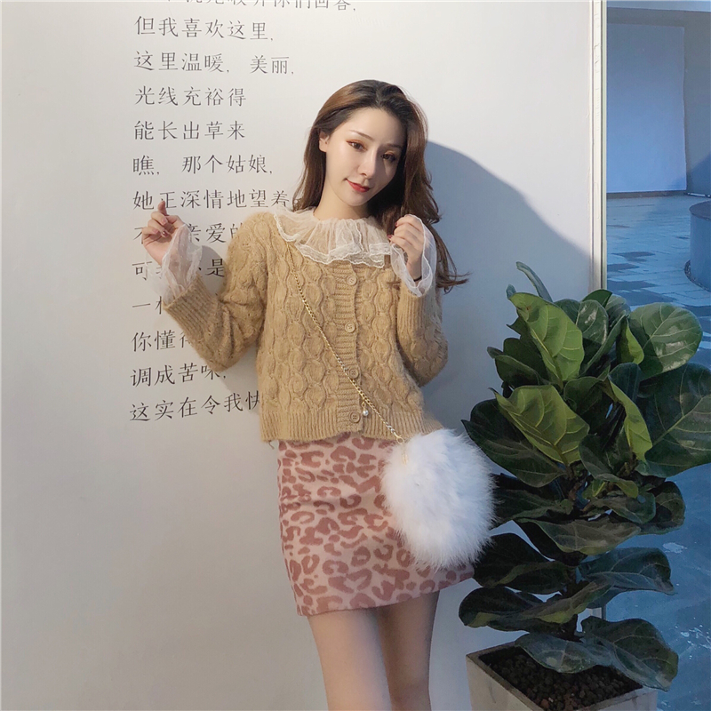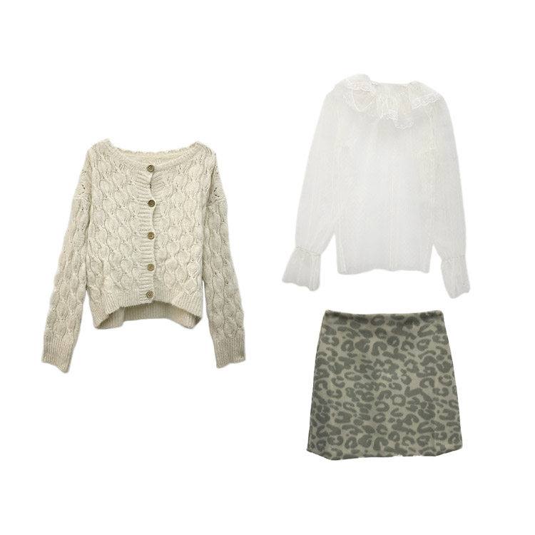 韓版仙女荷葉邊翻領打底衫+豹紋包臀裙+單排扣圓領毛衣女2018新款