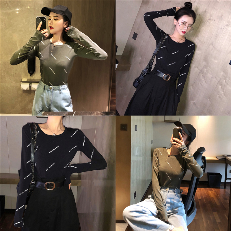 / chic早秋上衣女新款韓版T恤時尚字母印花高彈修身顯瘦長袖打底衫