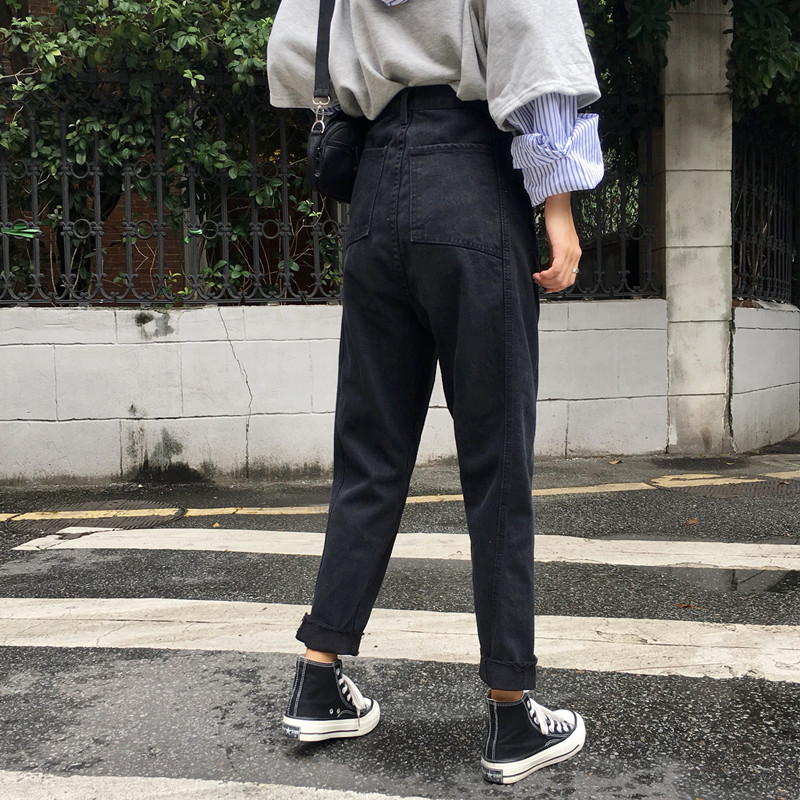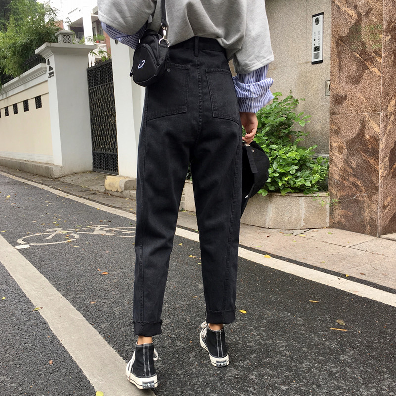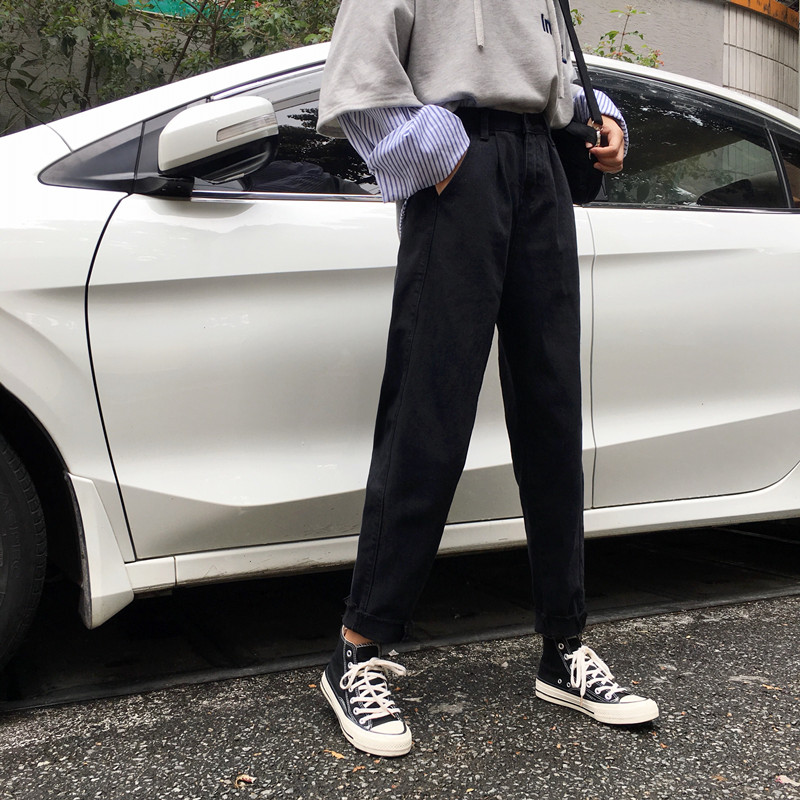 / 秋季韓版寬松黑色牛仔褲高腰顯瘦闊腿褲直筒褲長褲簡約學生褲子女