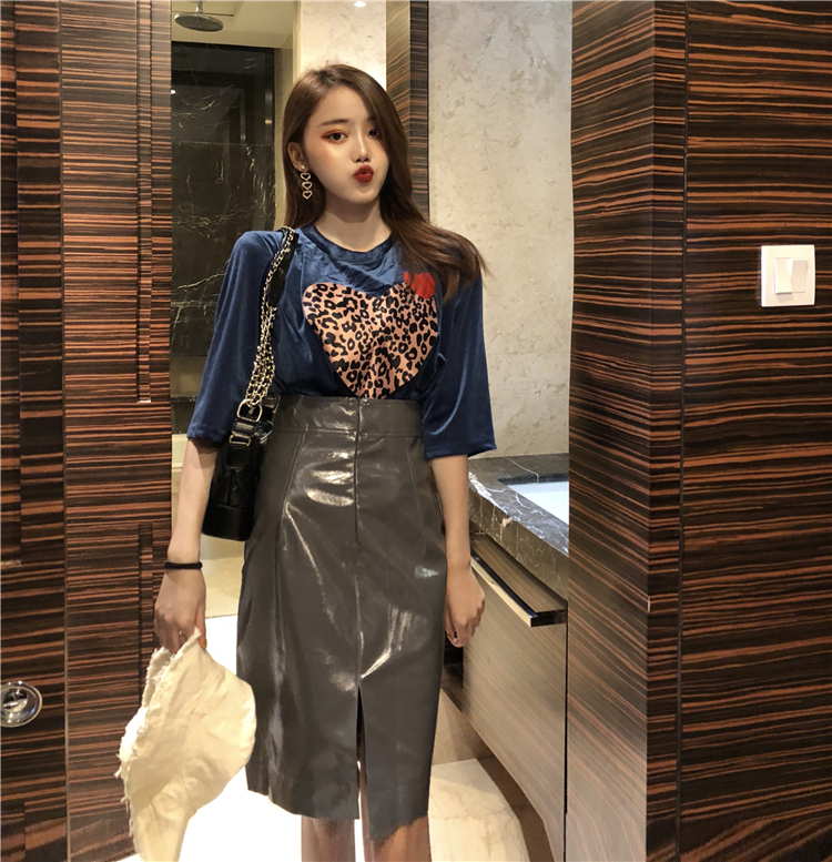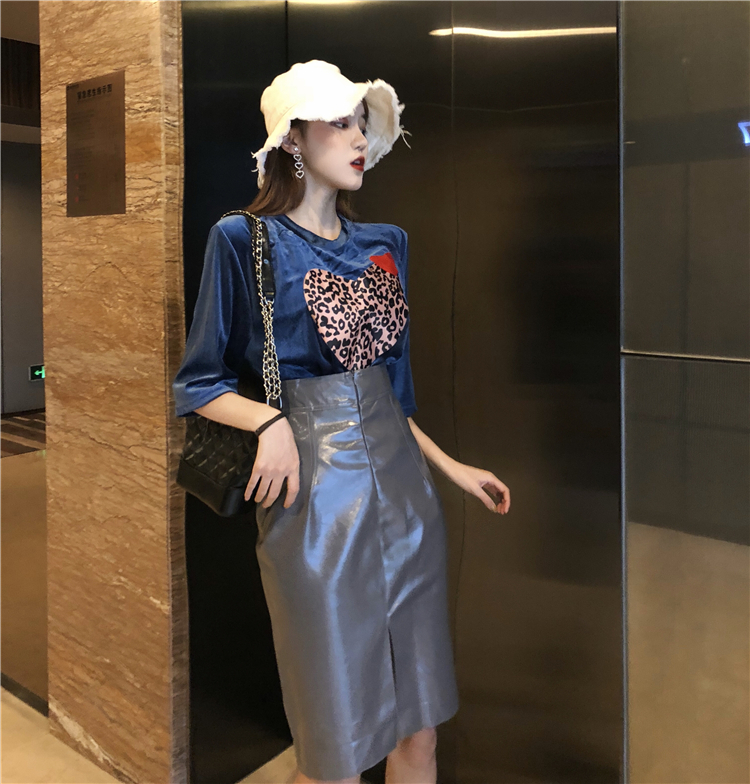 / 2018秋季新款港風街頭搖滾絲絨短袖T恤復古中長款亮皮裙時尚套裝