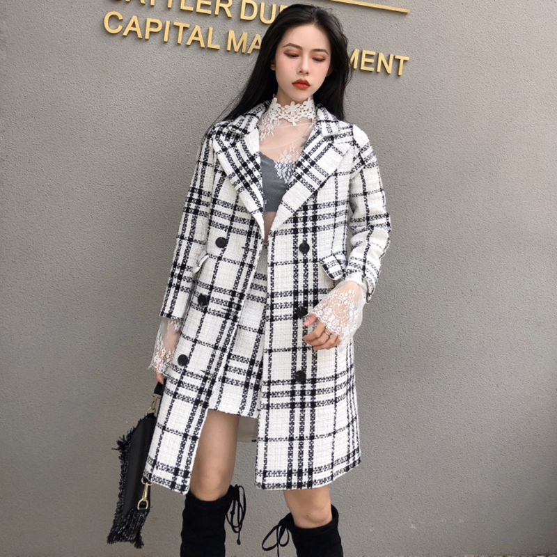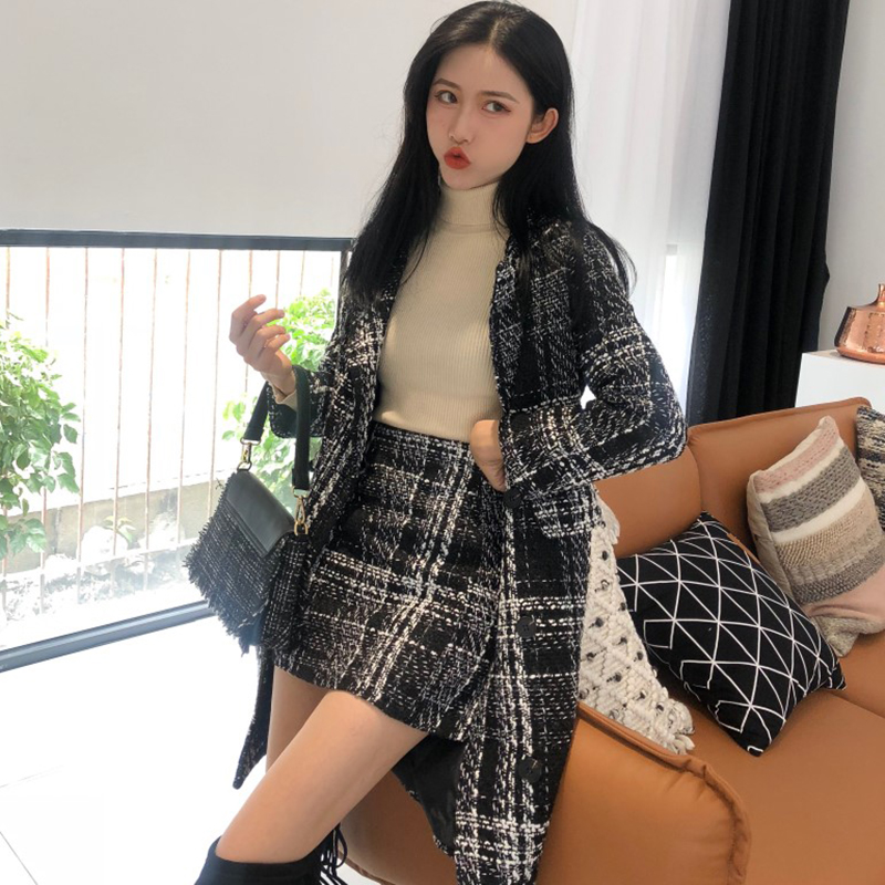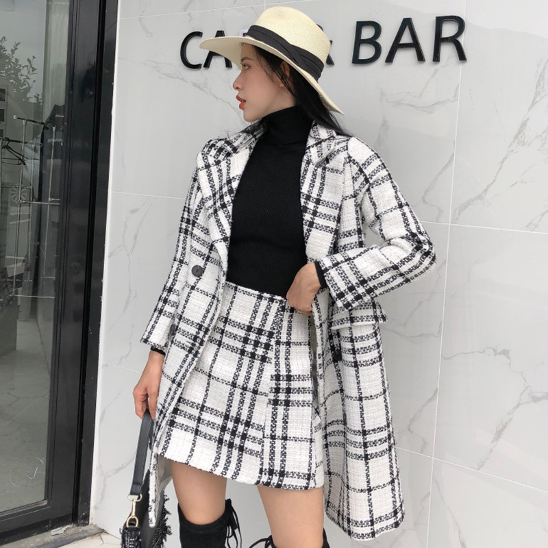 御姐套裝女秋冬新款格子西裝外套短裙修身針織衫長袖網紗打底上衣