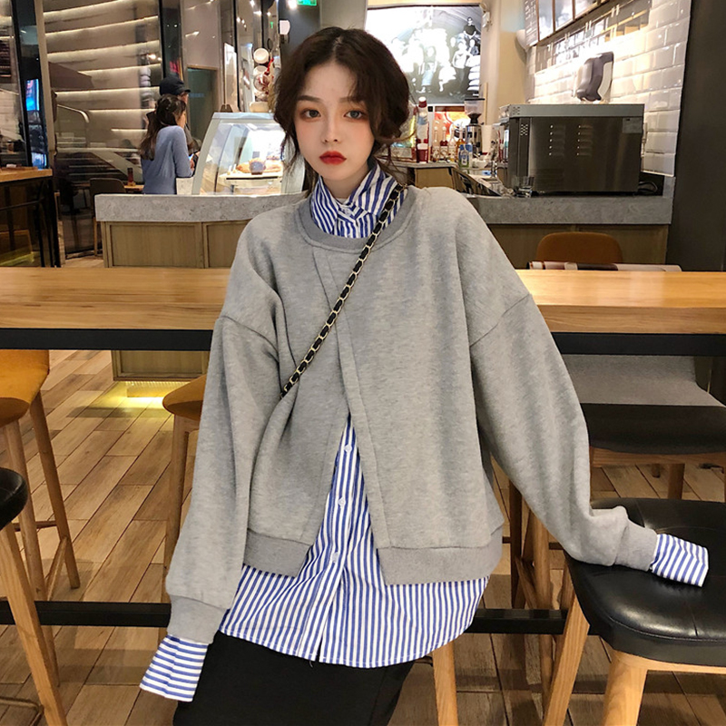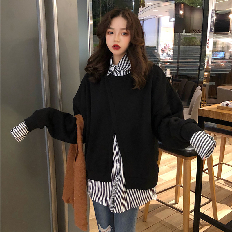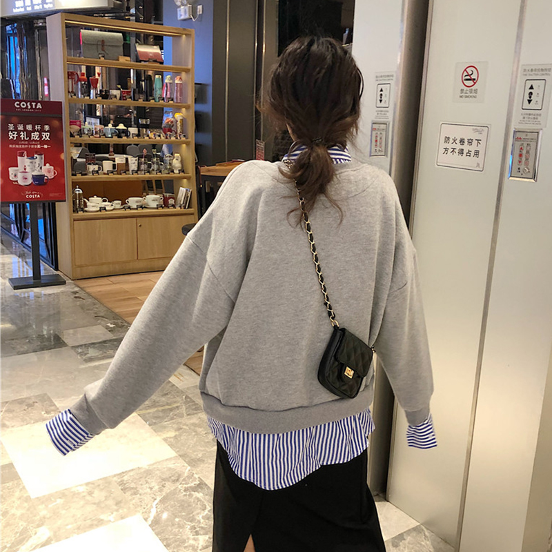 秋冬女裝2018新款韓版寬松假兩件條紋襯衣拼接加絨套頭衛衣外套潮